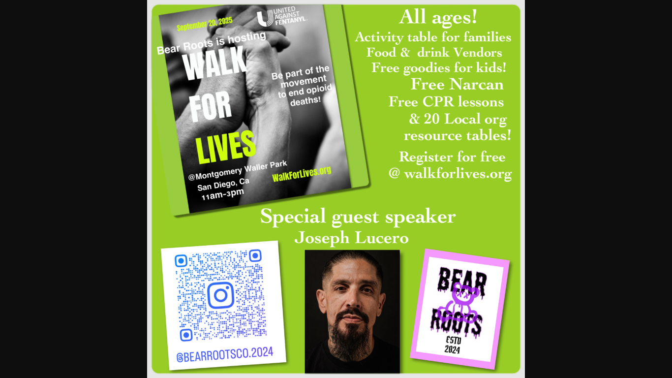Please register and attend the Walk for Lives event near you. Bear Roots will be leading the San Diego Walk for Lives. Our event will be taking place in the Montgomery Waller park and it will include a community walk followed by a health fair with speakers, resoufce booths, and a memorial to honor those we have lost and so much more. We also have a special celebrity guest who we will soon ask to make an announcement!!!